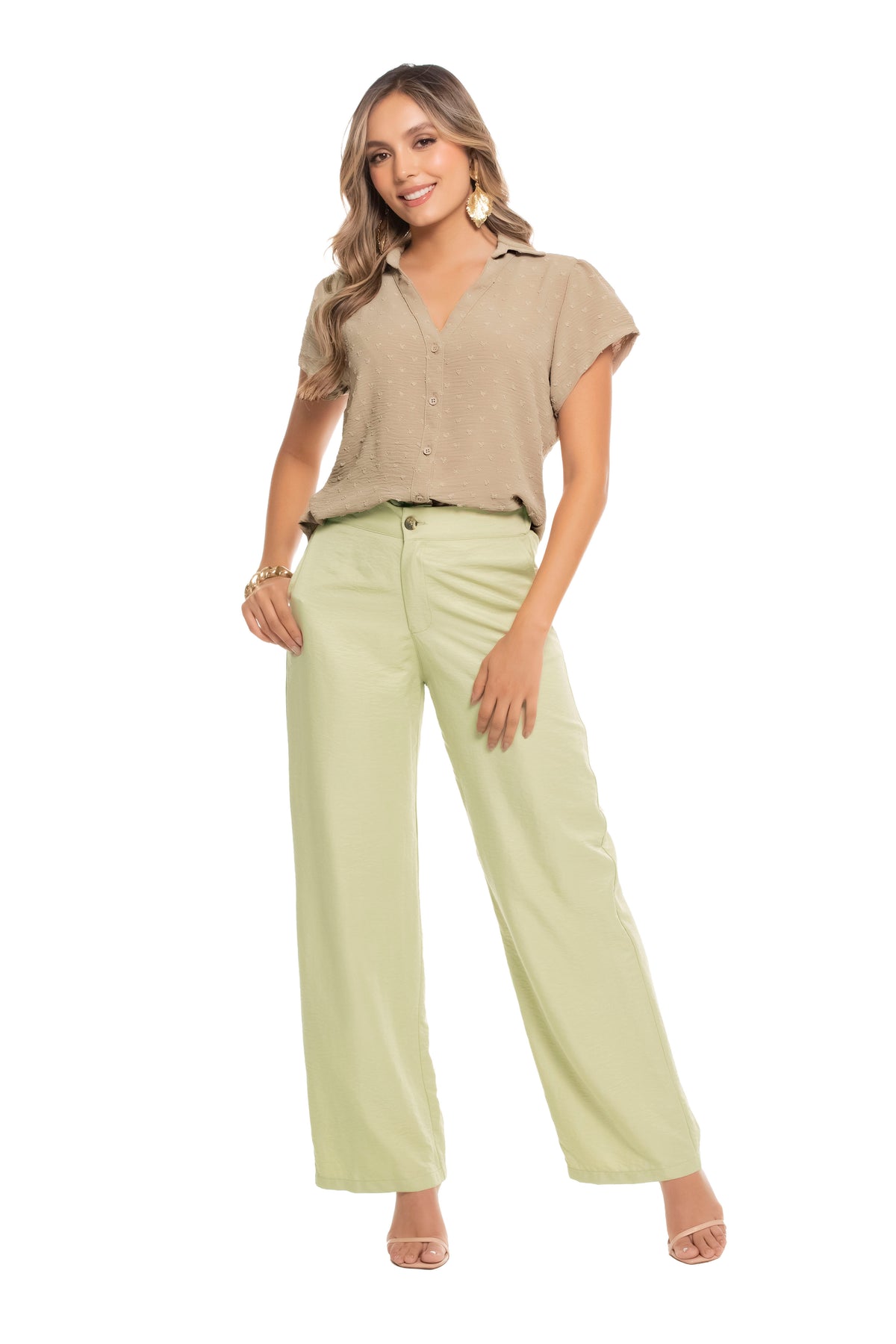 Blusa Para Dama Manga Corta Tejido Plano En Poliester. Silueta Semiajustada, Pequeño Relieve De Puntos, Cuello V, Corte Recto Ideal Para Looks Casuales