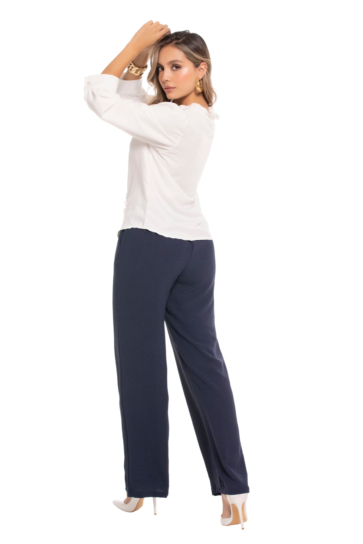 Blusa En Poliester. Silueta Amplia, Manga Larga Con Puño Recogido, Escote En V Decorado Con Volantes Y Botones Al Frente, De Corte Suelto Y Estilo Elegante.