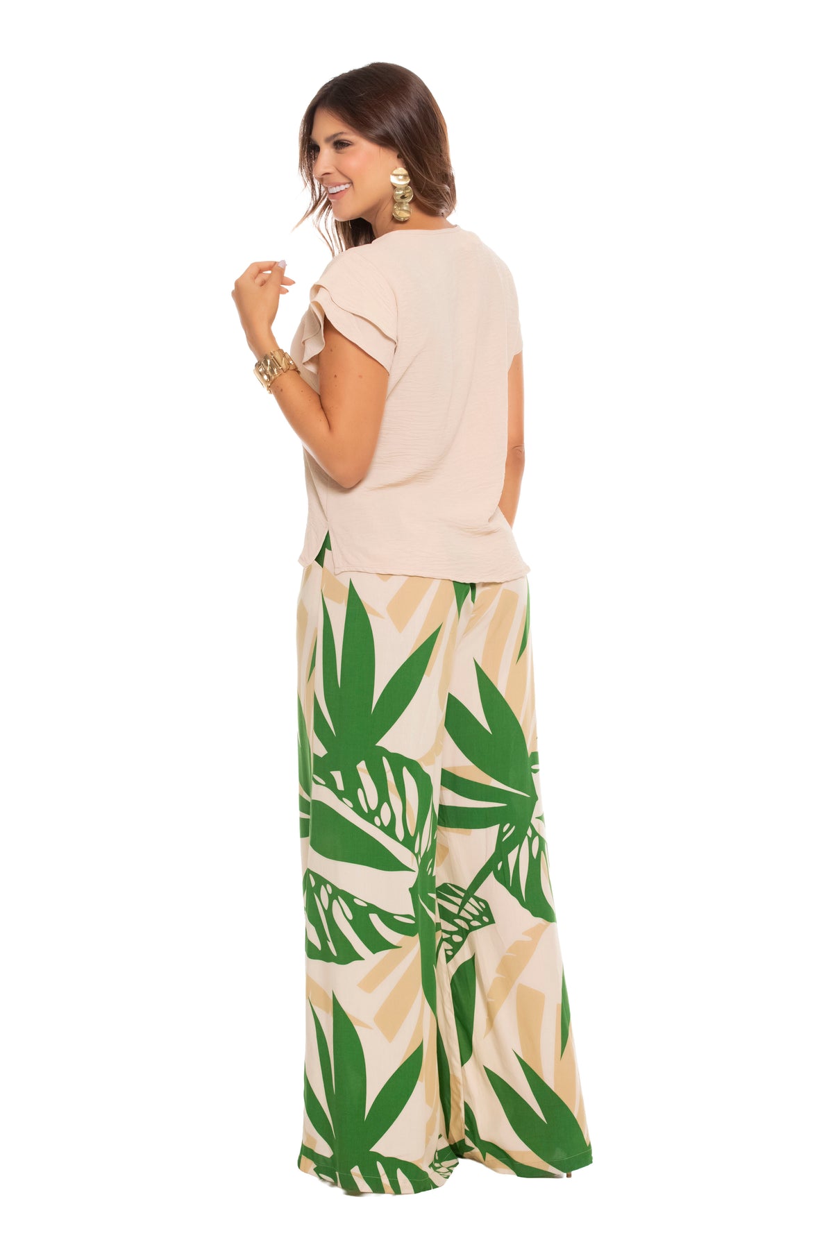 Pantalon En Rayon Viscosa Silueta Amplia, Tiro Alto Con Cinturón Del Mismo Tejido Para Ajustar En La Cintura, De Corte Recto Y Estilo Fresco Y Elegante-Casual