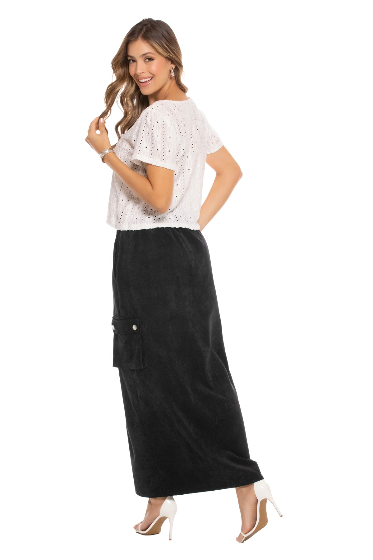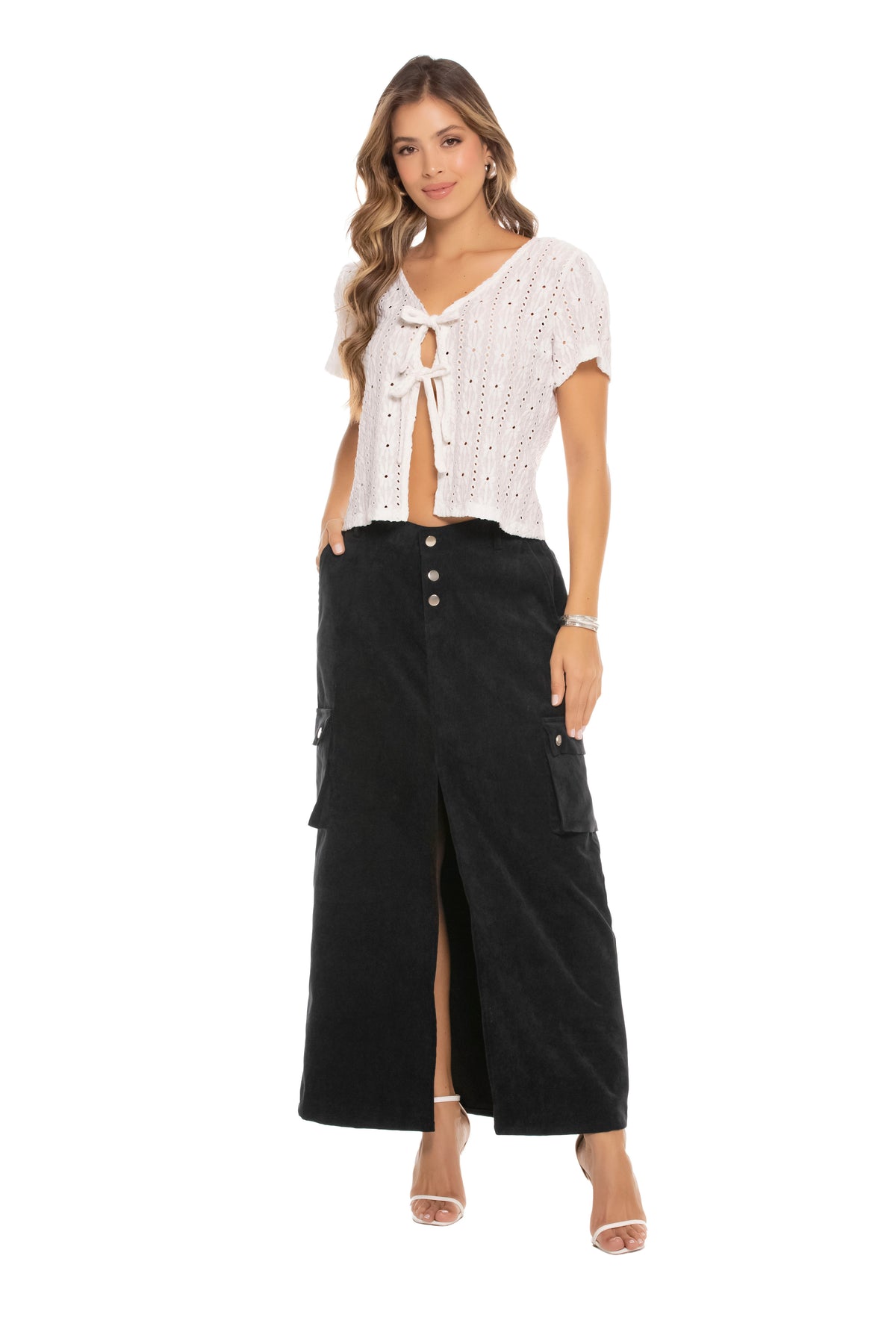 Blusa En Poliester Strech Silueta Semiajustada, Manga Corta Elaborada En Tela Calada, Con Escote En V Y Dos Lazos En La Parte Frontal Como Cierre, De Corte Corto Y Suelto, Que Aporta Un Estilo Femenino, Fresco Y Moderno.