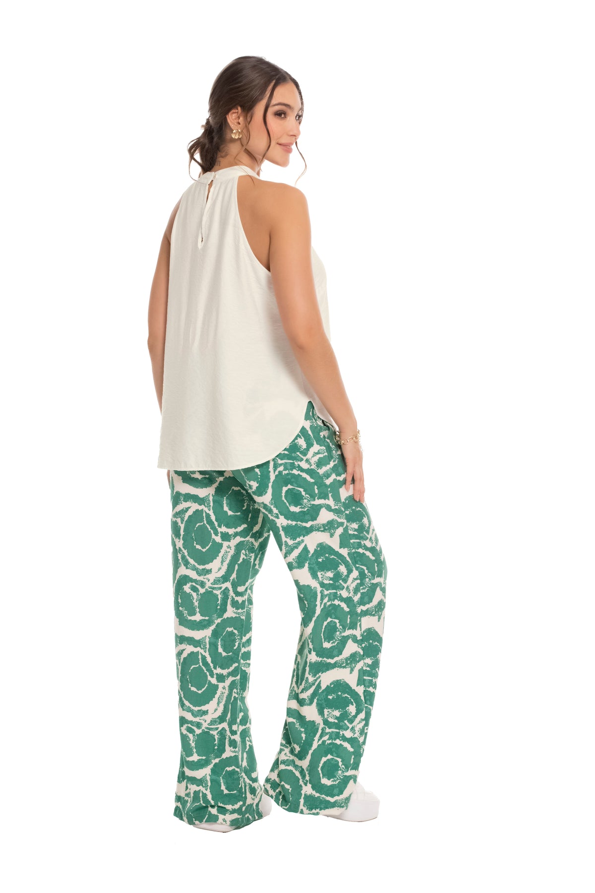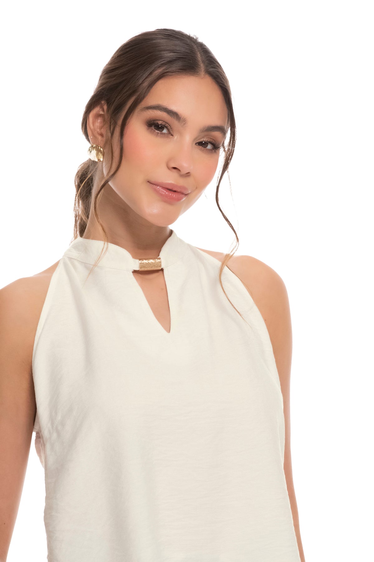 Blusa En Rayon Nylon Silueta Semiajustada, Cuello Alto O Semi-Alto) Que Deja Los Hombros Y Brazos Descubiertos. Su Principal Atractivo Es El Delicado Escote En "V" Con Un Aplique Rígido Dorado Que Le Añade Un Toque Sofisticado Y Joyero