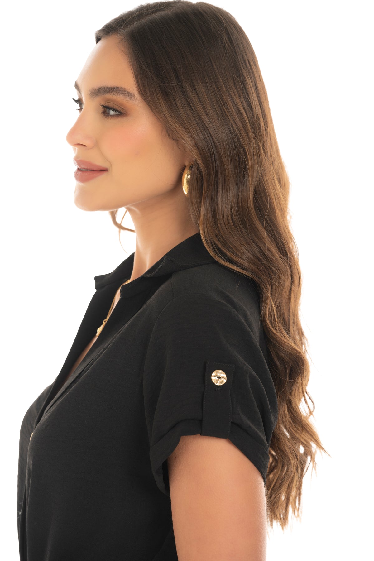 Si buscas un vestido elegante para mujer que estilice la figura, este vestido negro corto es perfecto. Su diseño con cinturón ajustable y botones frontales crea un look sofisticado y femenino.